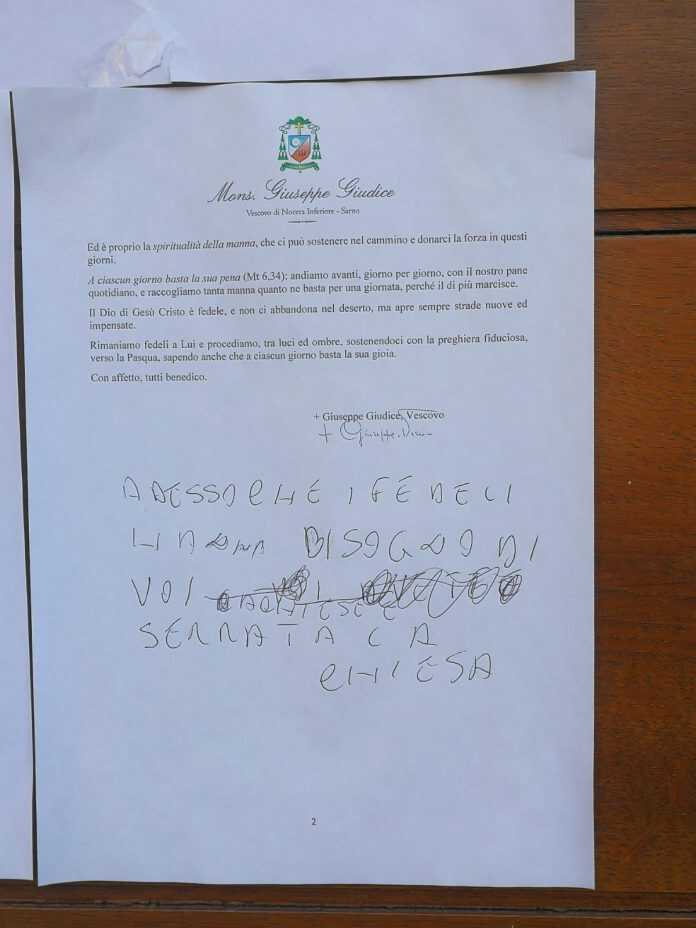 Il dibattito, anche se in presenza di ultimissimi chiarimenti e decisioni prese, potrebbe continuare all’infinito, anche tra i fedeli, anzi soprattutto tra i fedeli. Considerazioni e interpretazioni li lasciamo a voi, visto che l’Italia, anche nei momenti difficili, resta il Paese che perde le staffe per categoria. La foto, che evidenzia un intervento a penna, è scattata dinanzi alla centralissima chiesa di Santa Maria al Presepe, per tutti Santa Monica.