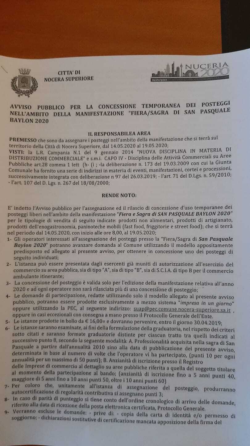 La stessa parte di opposizione ha scoperto che l’assessore al ramo del commercio del Comune di Nocera Superiore, di concerto con il responsabile di Settore, in data 17.03.2020 sul sito dell’albo pretorio ha pubblicato il bando per l’assegnazione posti per la nota festa dei Madonnari di San Pasquale di Pecorari di Nocera Superiore. Scelta apparsa del tutto inopportuna, in piena emergenza sanitaria, sapendo benissimo che la festa non si potrà fare-