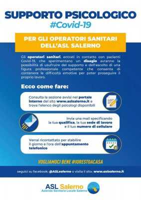 Il protocollo attivato dall’ASL SALERNO prevede l’istituzione di uno sportello psicologico telefonico, quale strumento di primo soccorso psicologico, nei servizi territoriali sanitari, con l’ausilio di psicologi, dipendenti e specialisti ambulatoriali dell’Asl Salerno, che possa rappresentare un punto di riferimento di facile accesso per gli operatori sanitari dei presidi ospedalieri che insistono sul territorio della provincia.