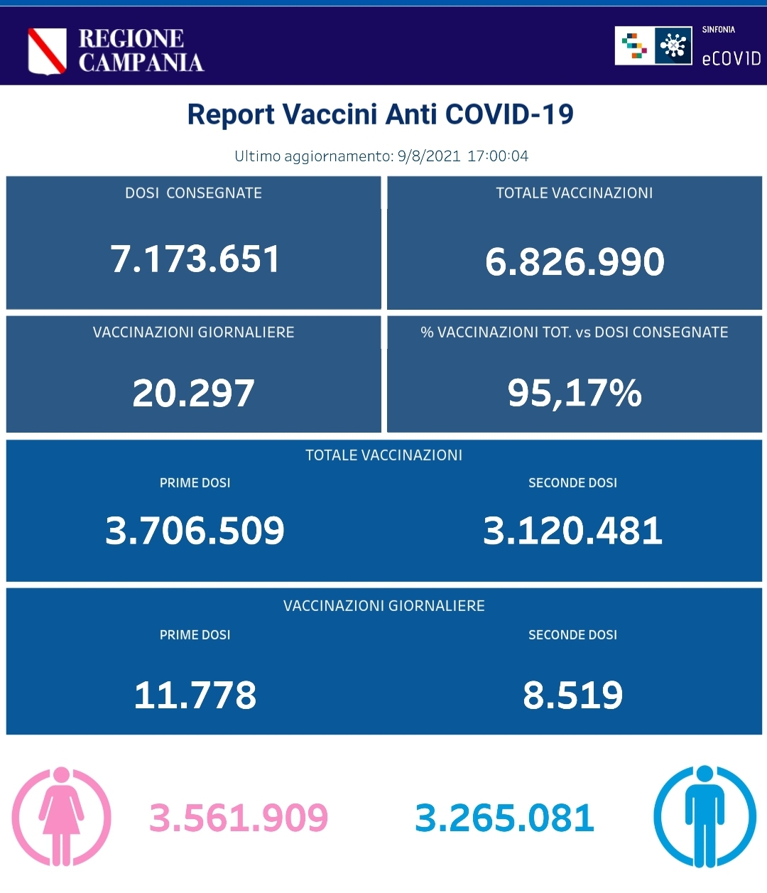 Ecco i dati delle vaccinazioni in Campania aggiornati alle ore 17.00 di Lunedì 9 agosto 2021. Complessivamente sono stati vaccinati con la prima dose 3.706.509 cittadini. Di questi 3.120.481 hanno ricevuto la seconda dose. Le somministrazioni effettuate sono state, in totale, 6.826.990.