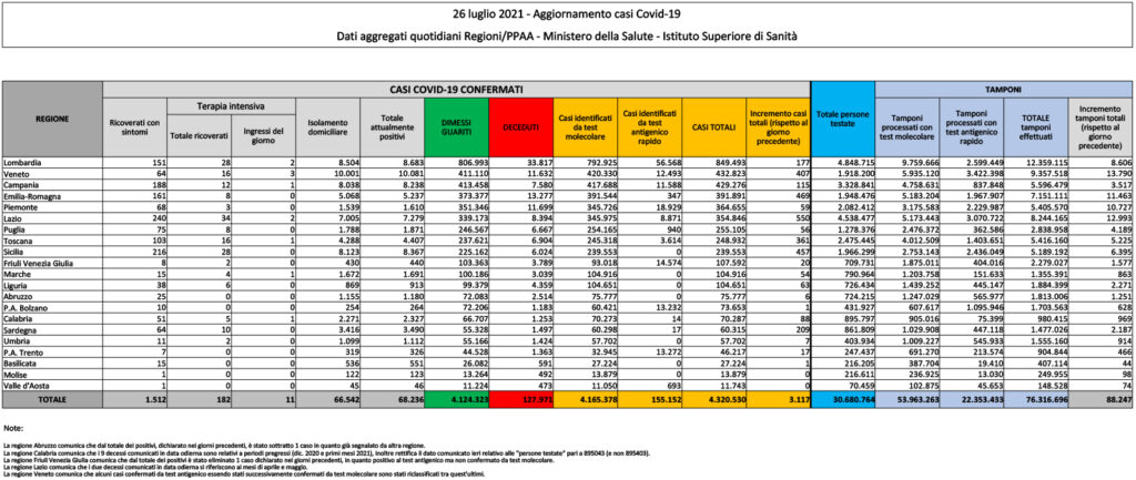 Potrebbe essere un'immagine raffigurante mappa e il seguente testo "CORONAVIRUS LA SITUAZIONE IN CAMPANIA OGGI TEST 1.923 REGIONECAMPANIA CAMPANIA POSITIVI 115 (A) dati riferiscono NUMERO TEST ANTIGENIC soli tamponi molecolari DECEDUTI 1.594 POSTI LETTO (B) nelle ultime 48 ore DISPONIBILI TERAPIA INTENSIVA 656 12 OCCUPAT BOLLETTINO DEL 2021 ALLE 23:59 DEL 25 LUGLIO 2021 DEGENZA 3.160 (C) 188 (C) Posti letto Covid Offerta privata Dati ufficiali dell'Unità Crisi Regionale per| realizzazione misure per prevenzione gestione ell'emergenza epidemiologica COVID- 19"