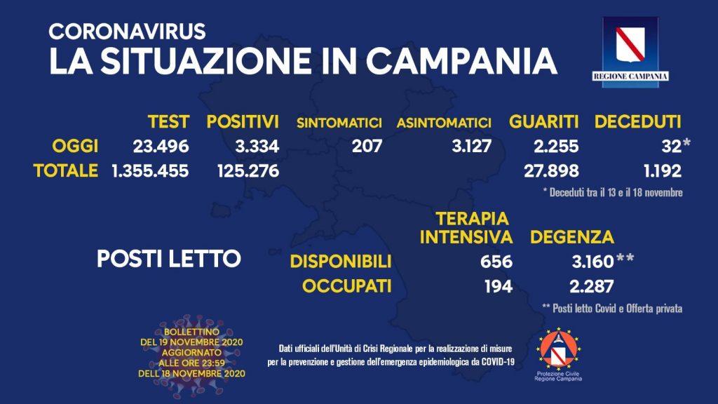 32 decessi oggi, in calo rispetto ai 75 di ieri, anche il numero dei positivi ieri 3.657, oggi 3.334.