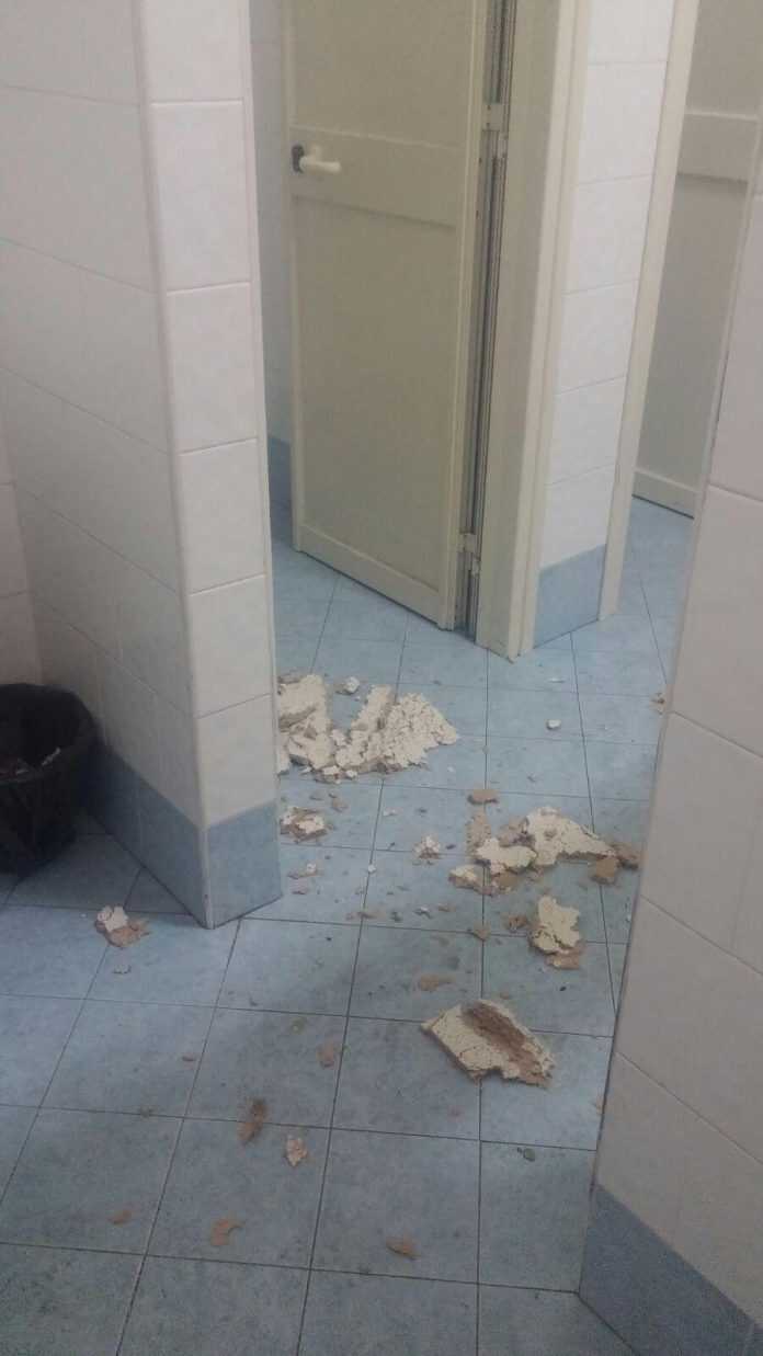 A causare l’incidente, ha spiegato la preside dell’Istituto Ester Cherri, le infiltrazioni d’acqua provenienti da una perdita della tubatura. Il bagno, intanto, è stato chiuso per motivi di sicurezza. Gli studenti hanno raccontato: “Un pannello zeppo d’acqua si è sgretolato cadendo sul pavimento dei bagni del piano inferiore. Alcuni pezzi sono caduti sulla testa di una studentessa che, per fortuna, non è rimasta ferita”. Il presidente Canfora ha assicurato il massimo impegno per garantire la sicurezza e affinché la situazione torni presto alla normalità ribadendo il concetto che “senza risorse e con i tagli decisi dallo Stato la Provincia non può fare miracoli”.