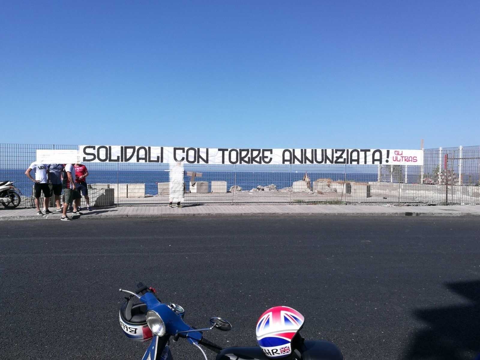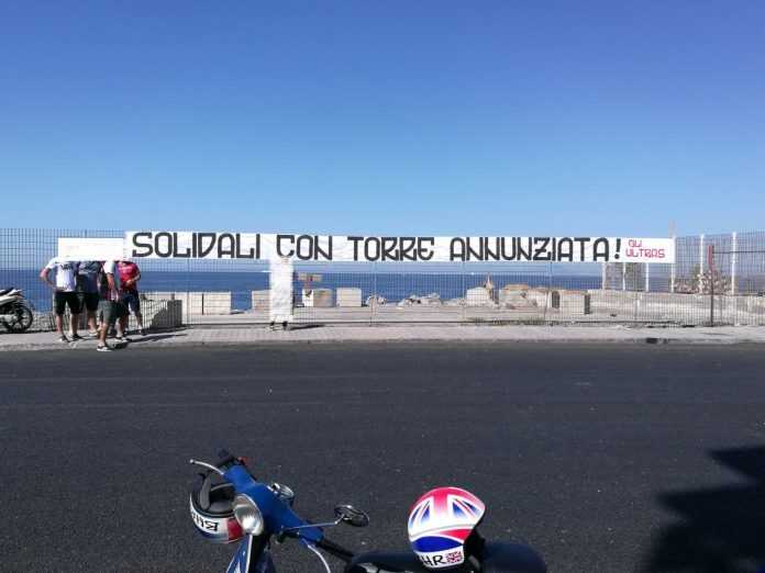 Solidali con Torre Annunziata“. Recita così uno striscione esposto dagli ultras corallini in città, in zona Litoranea.