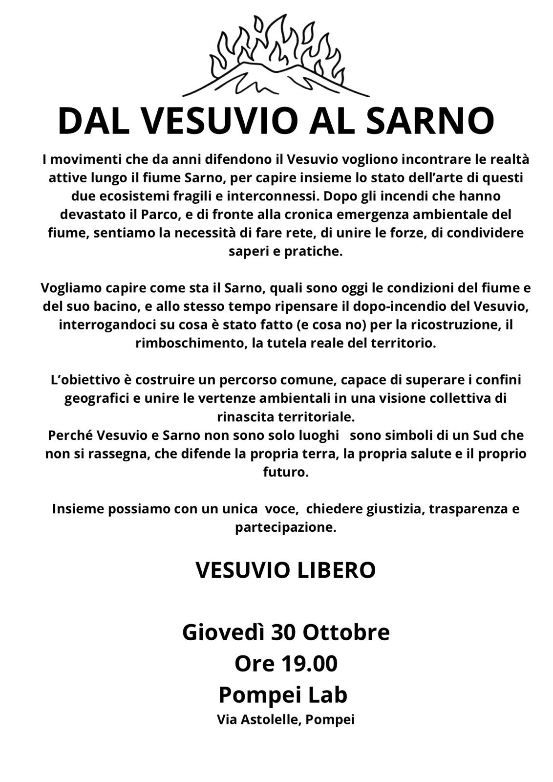 I movimenti attivi da anni nella difesa del Vesuvio e del fiume Sarno uniscono le forze per un importante incontro volto a fare il punto sullo stato di salute di due ecosistemi cruciali e interconnessi della Campania. L’evento previsto giovedì 30 ottobre, intitolato “DAL VESUVIO AL SARNO”, nasce dalla necessità di una risposta unitaria e coordinata di fronte alle croniche emergenze ambientali che affliggono la zona, aggravate dai recenti incendi che hanno devastato il Parco Nazionale del Vesuvio. L’iniziativa vuole essere un momento di “fare rete”, unendo forze, condividendo saperi e pratiche per comprendere a fondo le condizioni attuali del fiume Sarno e del suo bacino. Al contempo, l’attenzione sarà focalizzata sul ripensare il dopo-incendio del Vesuvio, interrogandosi criticamente su quanto è stato fatto (e quanto è stato omesso) in termini di ricostruzione, rimboschimento e tutela effettiva del territorio. L’obiettivo primario è ambizioso: costruire un percorso comune, capace di superare i confini geografici e unire le diverse vertenze ambientali in una singola, potente visione collettiva di rinascita territoriale.
