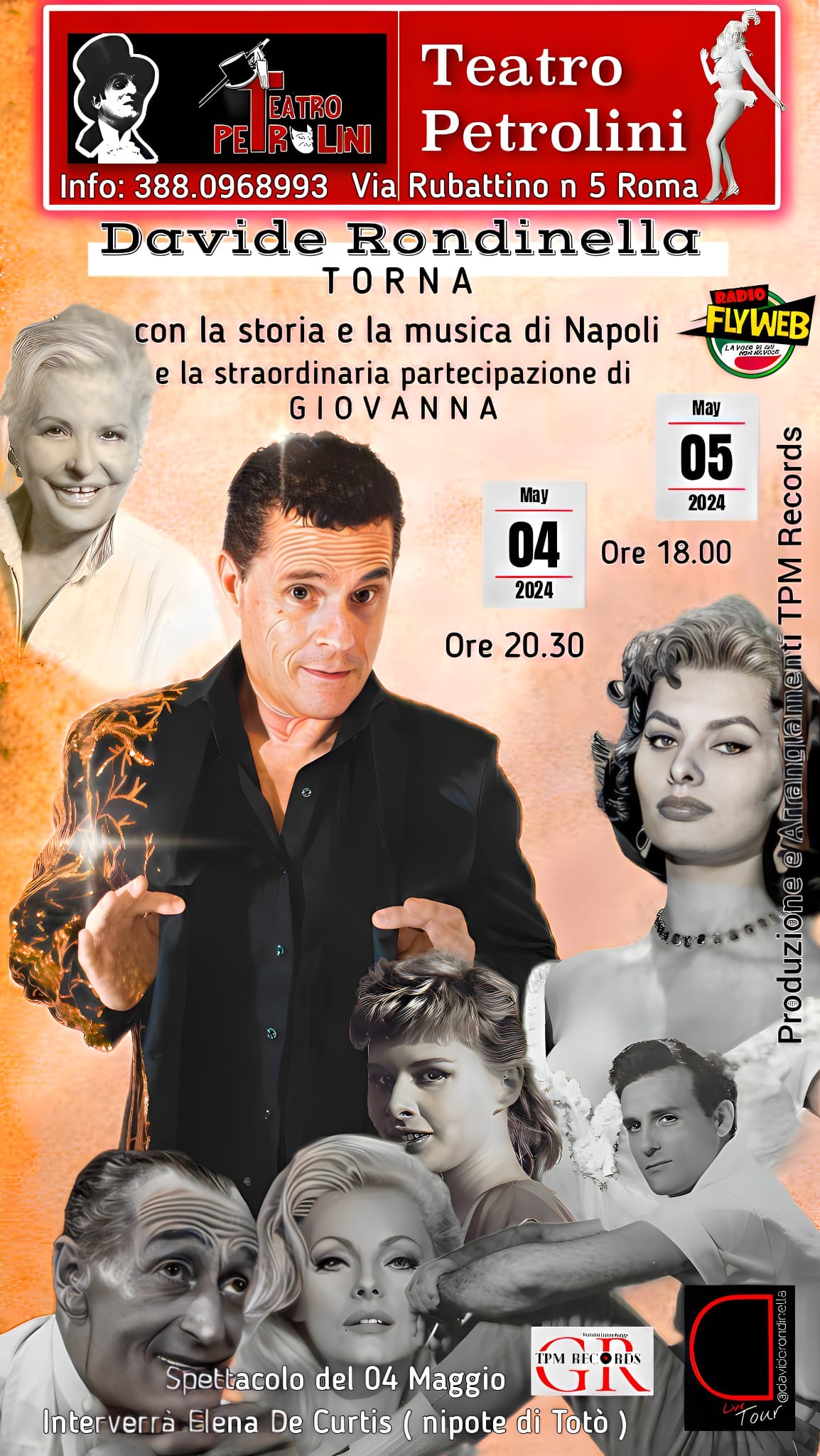 Quella della Capitale sarà una doppia tappa molto importante per Davide Rondinella, che ritorna nella Città Eterna proponendo uno show che racconta, attraverso le canzoni, la storia e la musica di Napoli.