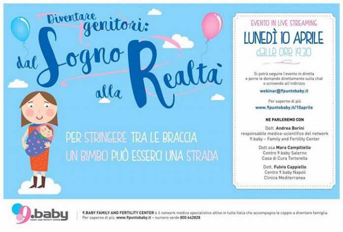 Avere un bimbo può essere un percorso più complicato del previsto. Una delle cause principali oggi è rappresentato dal crescente tasso di infertilità della coppia Quali sono le strade attualmente disponibili per le coppie che trovano ostacoli sulla strada della realizzazione del sogno di stringere un bimbo tra le braccia? Quali le evoluzioni della ricerca in materia? Quali novità hanno introdotto in questo campo i nuovi Livelli Essenziali di Assistenza (LEA), prestazioni che il Servizio Sanitario Nazionale si impegna a garantire in tutte le Regioni italiane? Se ne discuterà con gli esperti durante il live streaming organizzato da 9.baby, network medico specializzato nella diagnosi e cura della sterilità maschile e femminile e nelle tecniche di fecondazione assistita. Partecipare è molto semplice: basta collegarsi all’indirizzo web 9puntobaby.it il prossimo 10 aprile, a partire dalle 19.30 e fino alle 20.30 per poter porre, nella più assoluta privacy, domande direttamente sulla chat al dott. Andrea Borini, responsabile medico-scientifico del network 9.baby, alla dott.ssa Mara Campitiello, centro 9.baby Salerno – Casa di Cura Tortorella e al dott. Fulvio Cappiello, centro 9.baby Napoli – Clinica Mediterranea.
