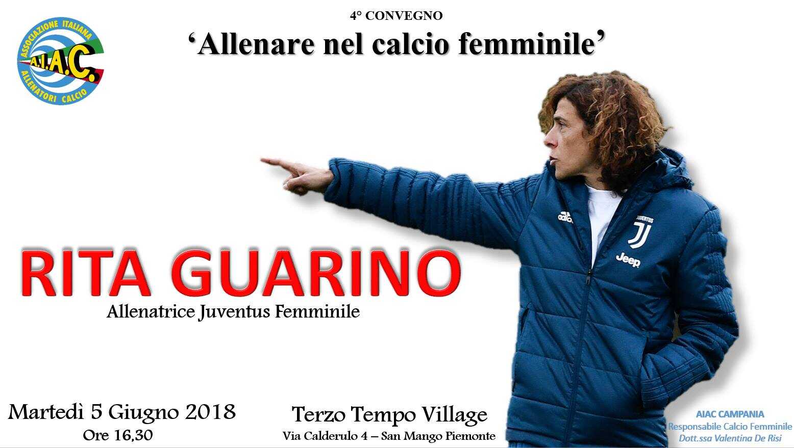 Ospite e relatrice dell’edizione 2018 sarà Rita Guarino, allenatrice della Juventus Femminile che ha vinto lo scudetto nelle scorse settimane, che porterà la sua lunga esperienza nel calcio in rosa: prima di allenare le bianconere, infatti, la Guarino è stata dal 2008 al 2015 assistente allenatore della Nazionale femminile Under 17, vincendo un bronzo agli Europei 2013 e un bronzo ai Mondiali 2014; dal 2015 al 2017 è stata inoltre allenatrice della Nazionale Femminile Under 17.