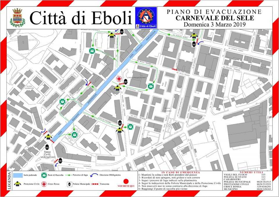 Anche per questa manifestazione è stato predisposto il Piano di Evacuazione a cura del Nucleo Comunale dei Volontari della Protezione Civile e istituito il presidio di primo soccorso con l’ausilio della Croce Rossa. Inoltre, sarà attivato il Centro Operativo Comunale (C.O.C) per assicurare la direzione e il coordinamento dei servizi di soccorso, di informazione e di assistenza. Per maggiori informazioni, consultare le ordinanze sulla circolazione stradale.