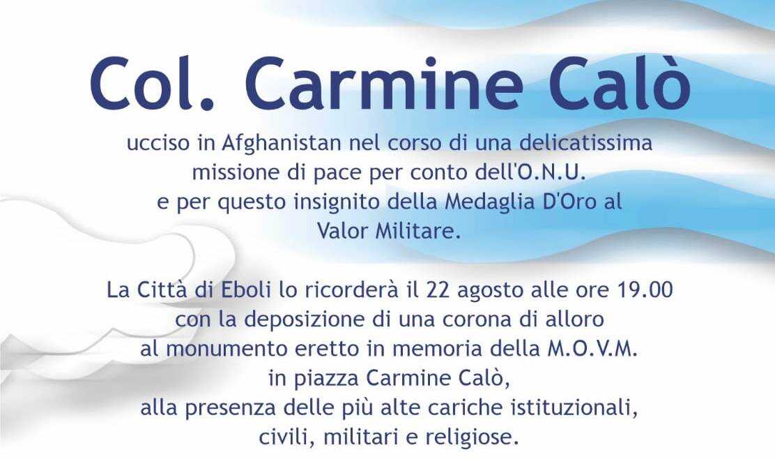 Sabato 22 agosto si svolgerà la cerimonia di commemorazione del XXII anniversario della scomparsa del colonnello Carmine Calò, M.O.V.M. La deposizione della corona di alloro in piazza Calò è prevista per ore 19.00. La partecipazione alla cerimonia è consentita, così come prevede la legge, esclusivamente indossando la mascherina facciale di protezione individuale e mantenendo il distanziamento sociale.