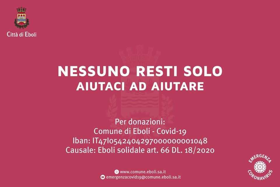 Per questo abbiamo istituito un conto corrente comunale per le donazioni, affinché i più fortunati possano aiutare chi non ha i mezzi per affrontare gli effetti di questo lungo isolamento. Dunque faccio appello a tutti, singoli cittadini, imprenditori, associazioni, fondazioni, enti ad aiutarci ad aiutare. A donare, trasformando il bisogno d’aiuto, in un gesto di altruismo. Sono certo che, anche questa volta, la “nostra” Eboli saprà mostrarsi generosa come sempre è stata nella comune difficoltà”.