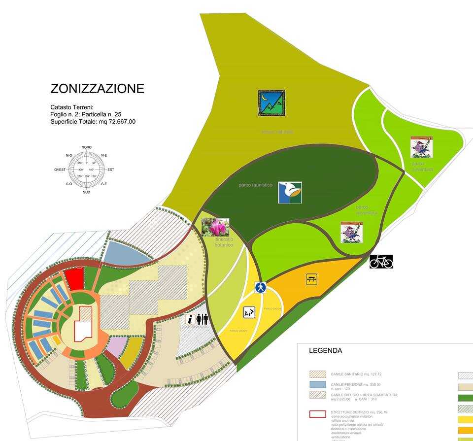 La superficie da destinare a canile è di 35.000 metri quadri. Il canile si divide in due attività distinte: il canile rifugio per cani trovatelli e la pensione destinata ad ospitare cani di proprietà privata, per soggiorni più o meno lunghi. Il canile rifugio è progettato per ospitare in totale 318 cani, con compartimenti diversi a seconda della taglia piccola, media, grande e gigante, con relative aree di sgambamento. Sono inoltre previsti un ambulatorio con reparto contumaciale ed un cimitero per animali.