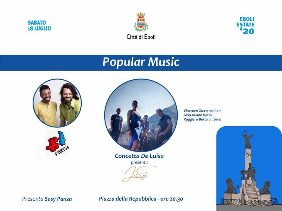 Sabato sera, in Piazza della Repubblica, primo evento del cartellone Eboli Estate 2020 con “Popular Music”. Protagonista Concetta De Luisa, cantante ebolitana già vincitrice del Festival di Napoli, che presenta Jetset con Vincenzo Greco alle tastiere, Gino Ariano al basso e Ruggiero Botta alla batteria. In apertura, il concerto di Puzzle, nuovo ed avvincente progetto musicale dei fratelli Raffaele e Andrea Scocozza. Presenta Sasy Panza con inizio degli spettacoli alle ore 20.30