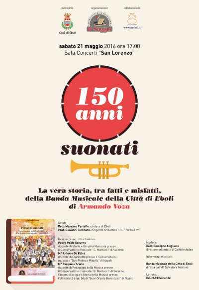 Sabato 21 maggio, il Centro Culturale Studi Storici, con il patrocinio del Comune di Eboli ed in collaborazione con Weboli, presenta il libro “150 ANNI SUONATI – La vera storia, tra fatti e misfatti, della Banda Musicale della Città di Eboli” di Armando Voza (Edzioni “Il Saggio”) presso la Sala Concerti “San Lorenzo”. Inizio ore 17.00. Saluti: