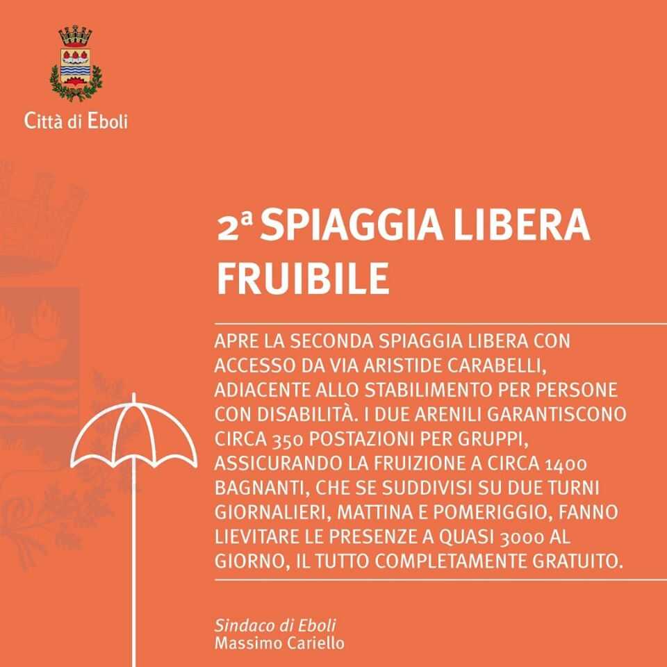 Dopo l’arenile nei pressi della Casina Rossa, già aperto alla fruizione dei bagnanti, domani, sabato 20 giugno, apre anche la seconda spiaggia libera con accesso dallo spartifuoco di via Aristide Carabelli, adiacente allo stabilimento per persone con disabilità, lungo il litorale ebolitano.
