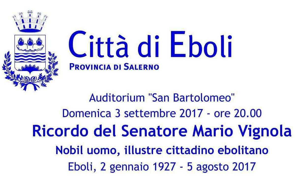 Il senatore Mario Vignola, scomparso qualche settimana fa e protagonista della vita politica ed amministrava di Eboli, sarà ricordato domenica alle 20 presso l’auditorium San Bartolomeo. All’incontro commemorativo interverranno il sindaco di Eboli, Massimo Cariello e il giornalista Vito Pompeo Pindozzi; l’evento sarà moderato dal giornalista Eugenio Verdini.