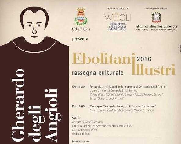 Si svolgerà oggi il terzo appuntamento della rassegna storico-culturale “Ebolitani illustri”, ideata dal Comune di Eboli e da Vito Leso, del portale turistico e culturale Weboli, con la giornata di studio dedicata al poeta Gherardo degli Angioli. Prevista anche la partecipazione degli Istituti di Istruzione Superiore di Eboli Perito-Levi-Daniele, A. Gallotta e Mattei-Fortunato.