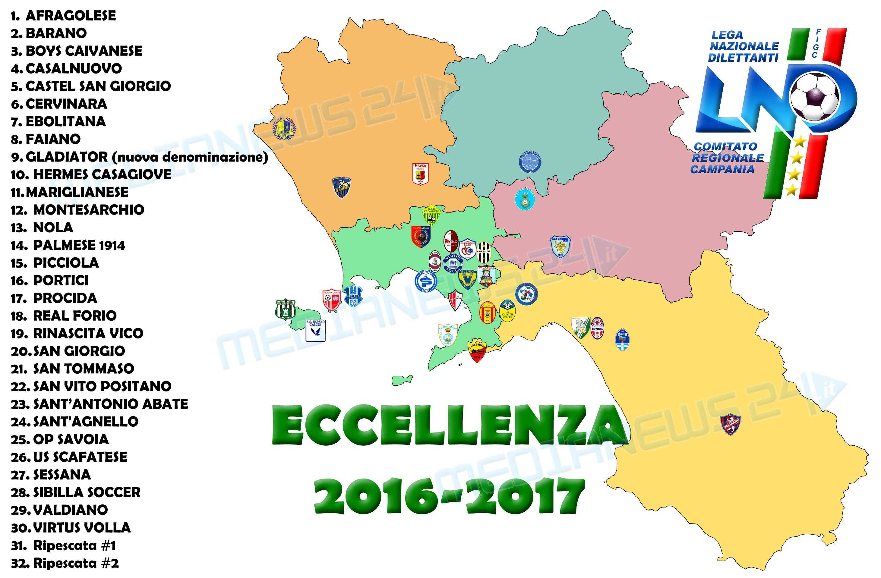 Maggioranza di formazioni della provincia di Napoli, a seguire quelle della provincia di Salerno, poi le altre. Ma il quadro dei due gironi di Eccellenza Campania 2016-2017 non è ancora completo. Non essendoci state retrocessioni dalla Serie D, l’organico è al momento fermo a 30 squadre, con 2 posti ancora liberi per completare i gironi della nuova annata.