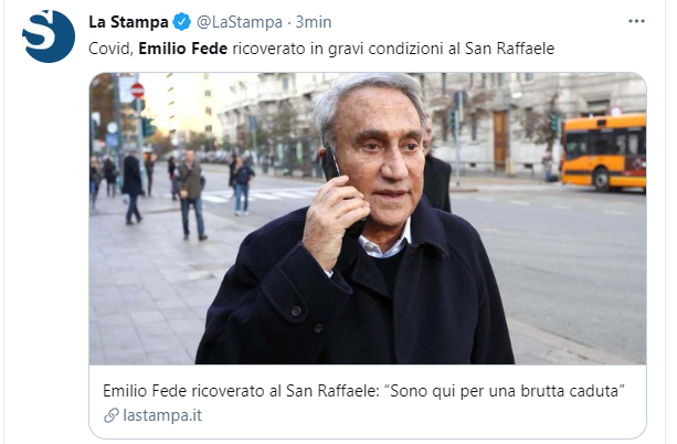 E’ la notizia di pochi minuti fa quella del ex direttore e giornalista, 89enne Emilio Fede ha confermato di essere ricoverato all’ospedale San Raffaele di Milano per una brutta caduta.
