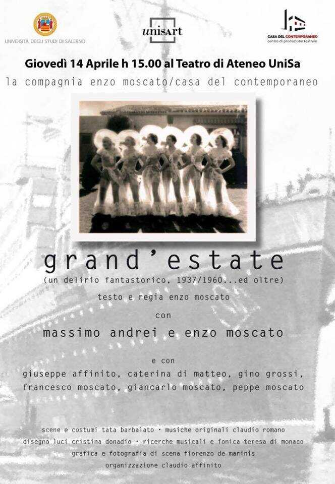 Giovedì 14 aprile 2016, alle ore 11, vi sarà l’incontro con la drammaturgia e scrittura di Enzo Moscato presso la Sala Dispac dell’Università degli Studi di Salerno. Introduzione e conclusioni spetteranno alla prof.ssa Antonia Lezza. Alle ore 15.00, presso il Teatro di Ateneo, verrà svolto lo spettacolo Grand’estate (testo, regia e drammaturgia Enzo Moscato. Scena e costumi Tata Barbalato. Produzione Casa del Contemporaneo. Musiche Donamos) con Massimo Andrei ed Enzo Moscato e con Giuseppe Affinito, Caterina Di Matteo, Gino Grossi, Francesco Moscato, Giancarlo Moscato.