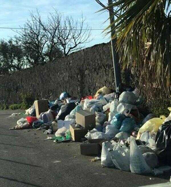 Rifiuti di ogni genere – nel completo dispregio delle disposizioni sul conferimento e sulla differenziazione – giacciono ai margini della strada, in alcuni punti perfino ostacolando il passaggio pedonale.