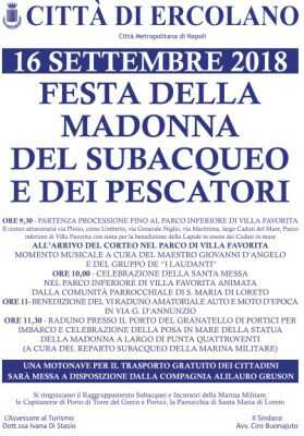 Si terrà domenica prossima la Festa della Madonna dei Pescatori e del Subacqueo, tradizione che si ripete da oltre 30 anni nella Città degli Scavi. Alle 9.30 la statua della Madonna partirà in processione dalla Parrocchia di Santa Maria di Loreto per arrivare al Parco sul Mare di Villa Favorita, dove si terrà la celebrazione religiosa. Dopodiché, dal molo del Granatello la statua verrà imbarcata su un mezzo della Capitaneria per essere posizionata nel Santuario posto a circa 20 metri di profondità. Dal molo di Portici partirà anche una motonave della Alilauro per consentire ai fedeli di assistere alla cerimonia in mare.