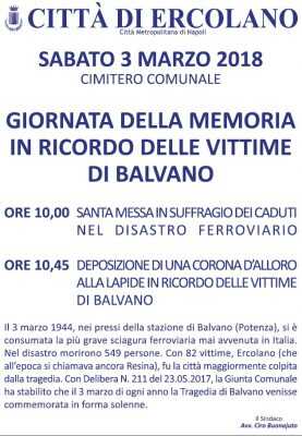 È in programma per sabato, presso il Cimitero comunale di Ercolano, la commemorazione della Tragedia di Balvano. Come stabilito dalla Giunta comunale (con la delibera n.211 del 23 maggio 2017), da quest’anno la Città di Ercolano terrà il 3 marzo di ogni anno una cerimonia per commemorare il disastro ferroviario in cui morirono decine di ercolanesi. Dopo una messa in suffragio delle vittime, l’Amministrazione Comunale poserà una corona d’alloro alla lapide che ricorda la tragedia.