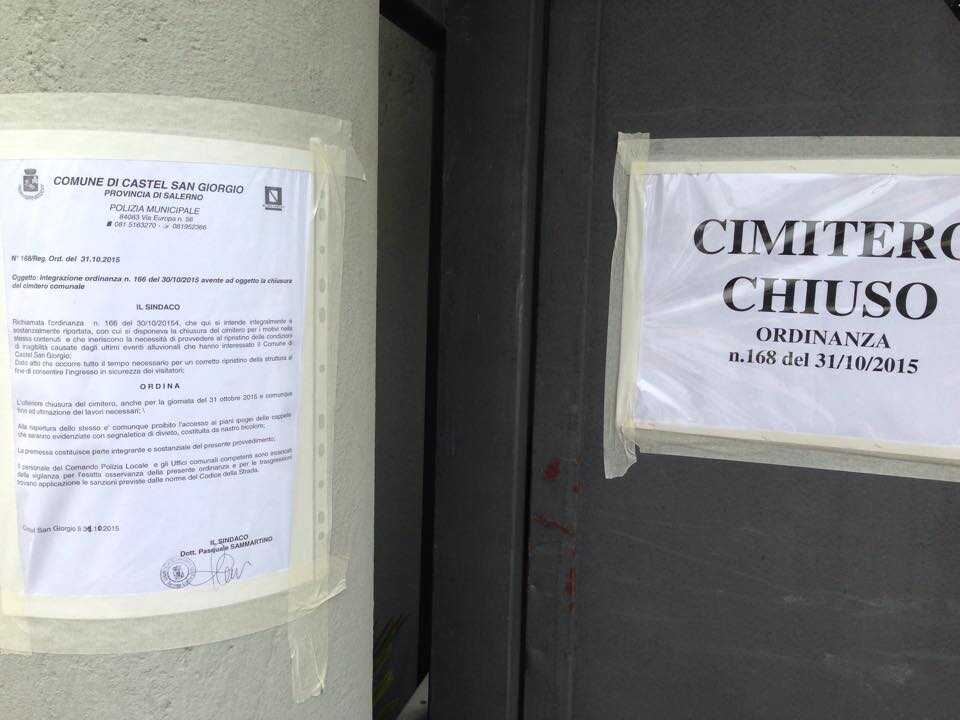 Il Sindaco di Castel San Giorgio, Pasquale Sammartino ha disposto la chiusura del Cimitero fino ad ultimazione dei lavori necessari. Il primo cittadino sentito il Responsabile del servizio cimiteriale,nonostante l’enorme sforzo profuso da tutto il personale impegnato nelle operazioni di ripristino del cimitero, a causa dei molti danni subiti dall’esondazione del torrente Solofrana, ha dovuto chiudure fino alle ore 15:00 di oggi il cimitero comunale.