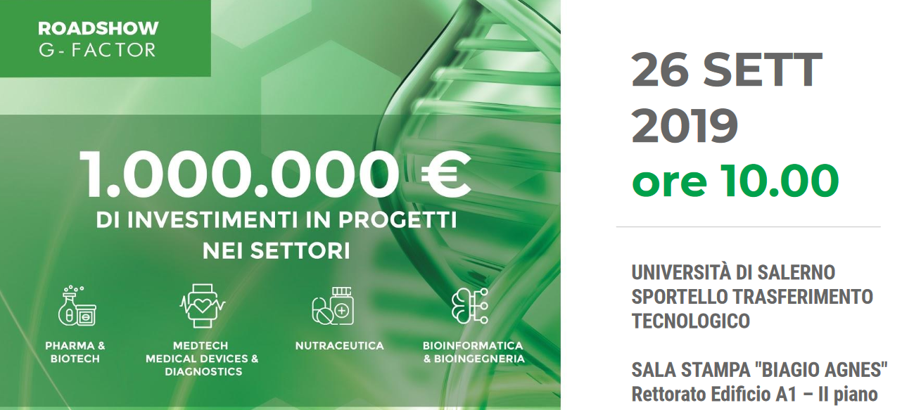 Giovedì 26 settembre alle ore 10.00 farà tappa al Campus di Fisciano il Roadshow di G-Factor per la presentazione della Call LIFE SCIENCE 2020 dell’incubatore-acceleratore della Fondazione Golinelli di Bologna. Possono partecipare alla call Startup, Spin-off, Docenti, Ricercatori, Assegnisti, Dottorandi e Studenti, singolarmente o in team, con idee innovative negli ambiti: