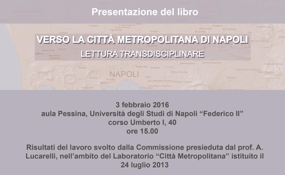 Mercoledi 3 febbraio 2016, alle 15, nell’Aula Pessina del Dipartimento di Giurisprudenza dell’Università degli Studi di Napoli Federico II verrà presentato il libro “Verso la Città metropolitana di Napoli. Lettura transdisciplinare” di Alberto Lucarelli e Dora Francese. Il volume raccoglie i risultati del lavoro svolto dalla Commissione presieduta dal professore Lucarelli, nell’ambito del Laboratorio “Città Metropolitana” istituito il 24 luglio 2013.
