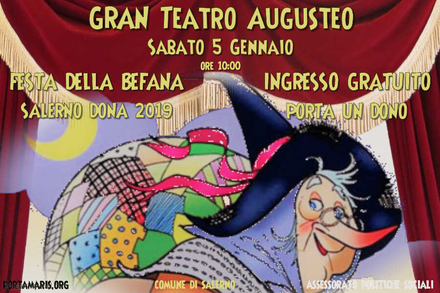 Porta Maris e l’Assessorato alle Politiche Sociali del Comune di Salerno invitano grandi e piccini a partecipare, sabato 5 gennaio dalle ore 10 al Teatro Augusteo, alla 3a edizione della “Festa della Befana: Salerno dona 2019”. Un percorso sociale e solidale finalizzato alla raccolta di doni per bambini meno fortunati. Uno spettacolo con la partecipazione e le esibizioni del coro “69in…Canto” dei bambini della scuola primaria del 69° Circolo Didattico “Stefano Barbato” di Napoli, del gruppo corale dei bambini della scuola “Medaglie d’oro” di Salerno e degli artisti del coro Daltrocanto diretto da Patrizia Bruno.