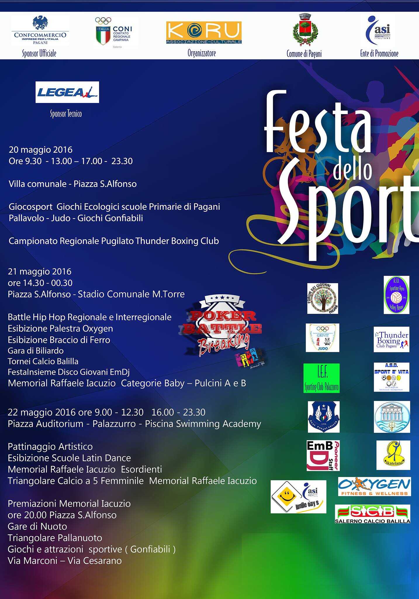 Pagani si appresta a vivere un nuovo momento all’insegna dello sport per le strade cittadine. Dopo la maratona che ha visto la partecipazione di diversi atleti presenti sul territorio, si punta alla kermesse che partirà alle 9.30 circa di venerdì prossimo in villa comunale. La manifestazione, organizzata dall’associazione Koru, vanta numerosi patrocini, quali il Comune di Pagani, il CONI, l’ASI (Associazioni Sportive Italiane) e Confcommercio. Numerose anche le associazioni sportive e non che hanno dato il loro fattivo contributo. E tra le tante, spicca per l’impegno il Forum dei Giovani.
