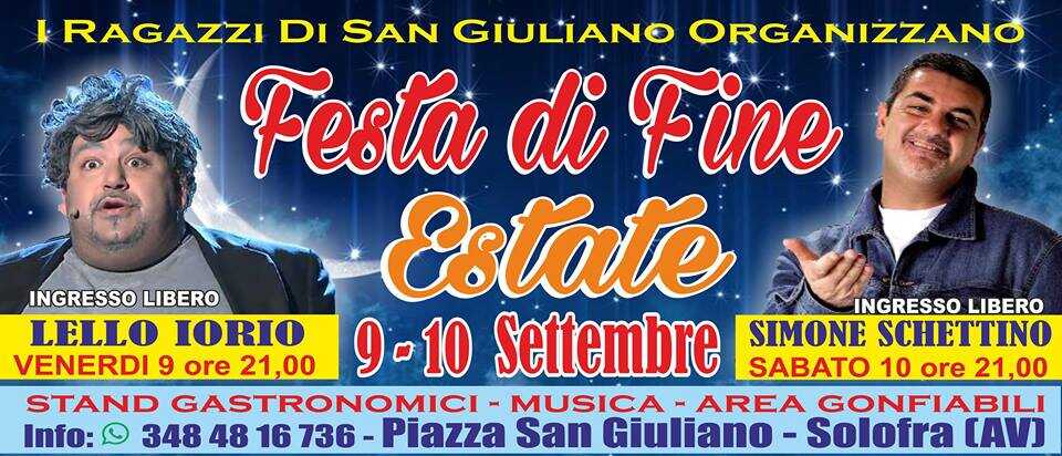 Due giorni all’insegna del divertimento e della buona gastronomia. Il 9 e il 10 settembre a Solofra andrà in scena la “Festa di fine estate” a cura dell’associazione I Ragazzi di San Giuliano. Le due serate saranno dedicate alla degustazione delle tipiche ricette locali accompagnate da piatti speciali che sapranno soddisfare anche i palati più esigenti, il tutto condito con musica e comicità. Venerdì sarà Nello Iorio di Made in Sud ad allietare la serata mentre sabato 10 sarà la volta di Simone Schettino. Per i più piccoli non mancherà il divertimento con giochi gonfiabili e animazione.