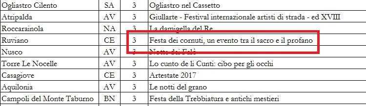 Sono 204 i comuni della Campania che andranno a dividersi qualcosa come 15 milioni di euro per festival, itinerari turistici, sagre e feste. Risulta dal Programma di eventi per la promozione turistica (giugno 2017/maggio 2018), stilato per il Poc Campania 2014-2020.  Sono 63 le manifestazioni sostenute con dotazioni singole di centomila euro a salire. E si va dai 100 mila euro dell’Ischia Global Film e Music Fest 2017 ai 100 mila euro, sempre ad Ischia, per Paraviso ‘e giuventù, viaggio attraverso la storia, le tradizioni e i luoghi di un’isola unica al mondo . Il Cilento domina con una serie di eventi: dal Festival di Torchiara (150 mila euro) agli Ambienti Mediterranei di Centola (150 mila euro), passando per Cilento: un modo di vivere a Pollica (126 mila 500 euro), Orchidee tutto l’anno di Sassano (99mila 500 euro), Cilento in Fiera a Cannalonga (110 mila euro), Sacro, profano e leggenda nell’oasi di Bosco Camerine (40 mila euro), Negro 2017: anime e profondità in musica (100 mila euro) di Pertosa, il Festival del turismo sostenibile di Padula (110 mila euro). Briciole per l’Agro: contributo, di 40mila euro, soltanto per Bracigliano (festa o’paese di o’cunti, a’musica e a’cerasa).