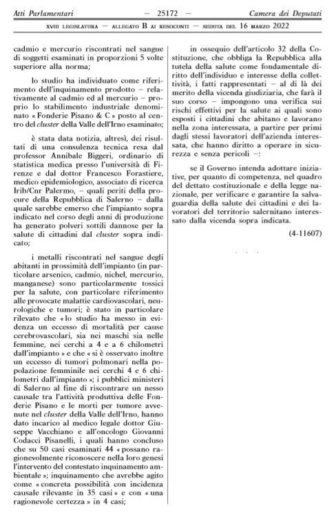 “Preoccupano i dati dello studio Spes dell’Istituto zooprofilattico di Napoli, confermati anche alcune consulenze tecniche rese da illustri periti nell’ambito dì una indagine penale della Procura della Repubblica di Salerno, sull’inquinamento dell’area dove ricadono le Fonderie Pisano di Salerno. Maggiore presenza di metalli nel sangue dei soggetti esaminati e importante presenza di polveri sottili, elementi particolarmente tossici per la salute. Il rischio per lavoratori e cittadini è altissimo”.