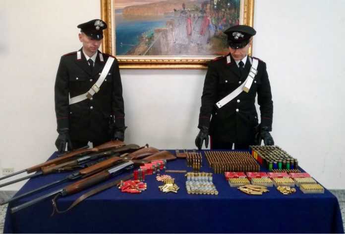 Proprio in quel momento è scattato l’intervento dei carabinieri che, bloccato il 45enne, hanno perquisito lo stabile e le pertinenze, rinvenendo in una cisterna di plastica 2 fucili da caccia con matricola abrasa e 2 carabine con le munizioni; nei sacchi bianchi c’erano oltre 3000 munizioni (più di 200 delle quali per armi da guerra) e materiale per il confezionamento dei colpi (polvere da sparo, ogive e bossoli).