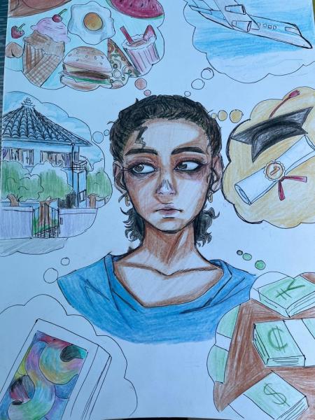 Molti lavori raffigurano bombardamenti incessanti: missili che distruggono case, aerei da guerra che sorvolano parchi e quartieri, e scene di vita da profughi. Ma accanto a queste immagini di violenza emergono i sogni dei bambini: un disegno mostra un bambino tra le macerie che sogna di laurearsi e diventare medico; altri rappresentano desideri di viaggiare, costruire una carriera di successo, avere piatti pieni di cibo e abitazioni integre, circondate da farfalle, fiori e cieli sereni.