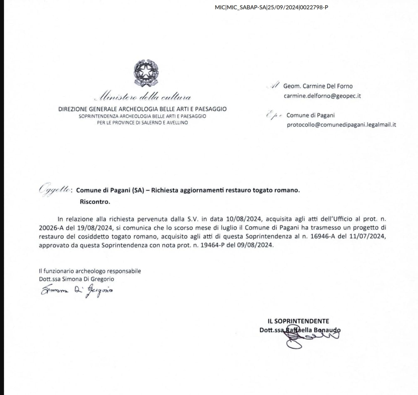 Atti amministrativi e dichiarazioni istituzionali delineano il percorso che ha portato al restauro del cosiddetto togato romano di via Matteotti (Lamia). Si è trattato di un intervento breve ma intenso, della durata di soli 3 giorni. Tuttavia, i lavori risultano a oggi incompleti; per tale ragione sono state interpellate le figure responsabili dell’epoca: la dottoressa Raffaella Bonaudo e la funzionaria archeologa di zona, la dottoressa Simona Di Gregorio. La dottoressa Bonaudo ha dichiarato di non ricoprire più il ruolo di Soprintendente, delegando quindi ogni richiesta di approfondimento alla dottoressa Di Gregorio. Quest’ultima, pur confermando l’avvenuta esecuzione del restauro (dal costo di 4.831,20 euro), ha scelto di non sbilanciarsi in merito al progetto complessivo presentato dall’amministrazione comunale, che prevedeva ulteriori interventi oltre al semplice recupero del monumento. «Queste decisioni non spettano al Comune», ha spiegato la dottoressa Di Gregorio, «ma rientrano in una procedura concordata con la Soprintendenza. Restano da completare i pannelli informativi e siamo in attesa di una proposta da parte dell’Ente comunale per una protezione più adeguata della statua». Tuttavia, emerge una discrepanza: in un documento ufficiale firmato da entrambe le responsabili in data 25 settembre 2024, si attesta chiaramente che la Soprintendenza aveva già approvato il progetto proposto dal Comune.