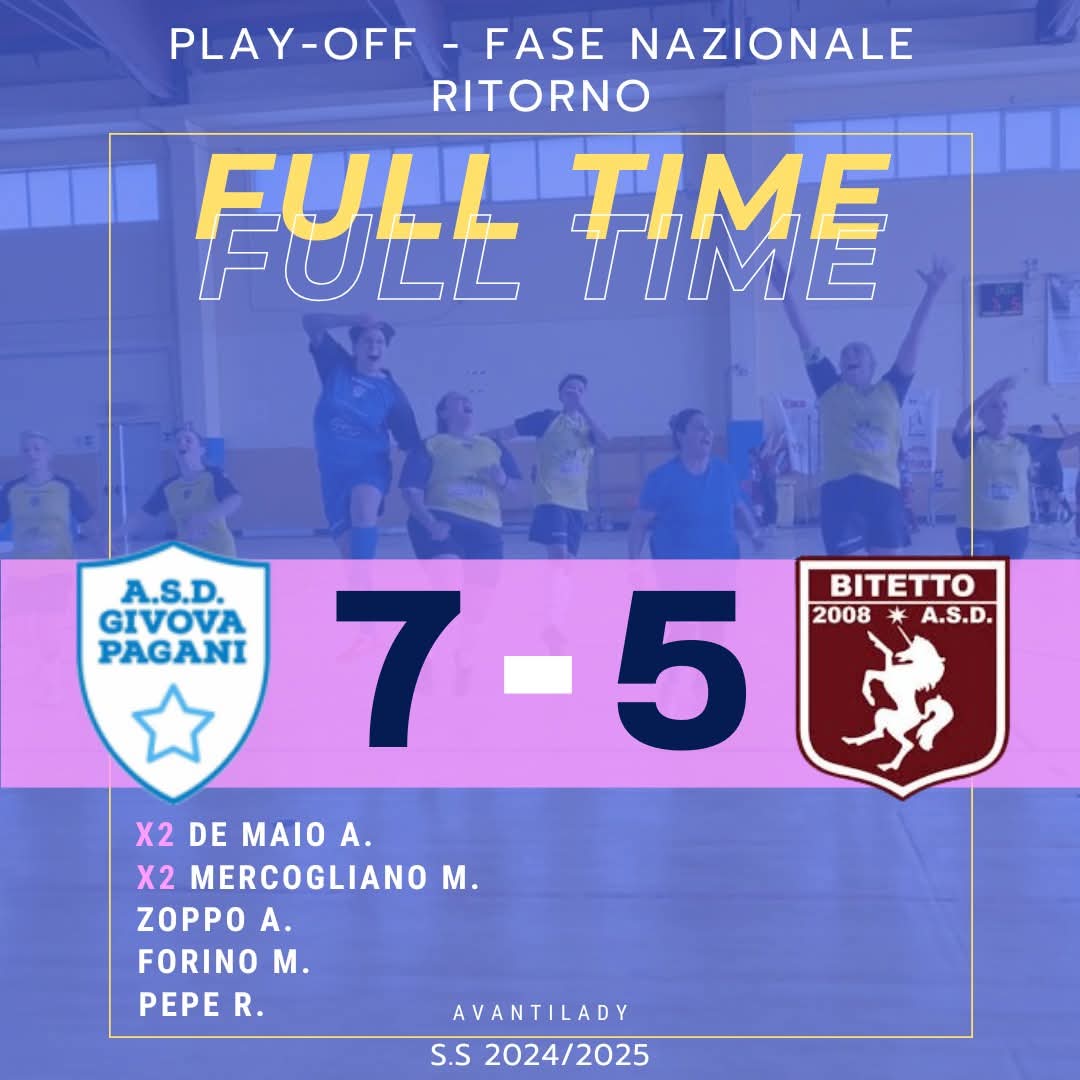 Nella ripresa la Givova Pagani continua a spingere e allunga nel punteggio con altre due reti di De Maio, in grande giornata, e una doppietta di Michela Mercogliano, protagonista assoluta nella seconda frazione. A firmare il sesto gol ci pensa Maria Forino, abile a sfruttare la superiorità numerica dopo un’espulsione tra le fila avversarie. Chiude i conti Rosa Pepe, con una zampata nel finale che spegne ogni speranza di rimonta pugliese.Il Bitetto prova comunque a reagire, segnando tre gol nel finale complice un calo fisico delle locali, ma non basta.