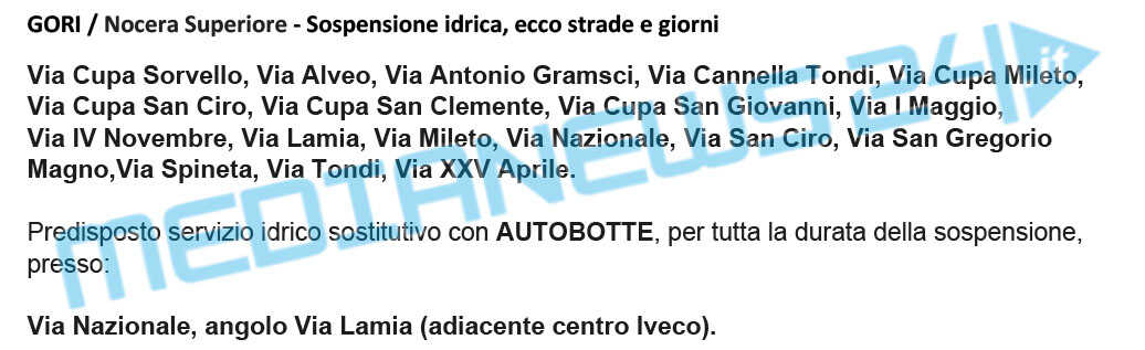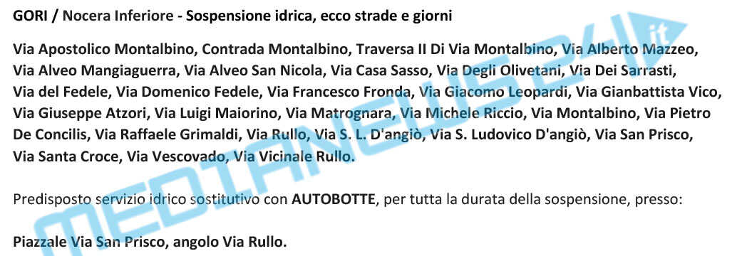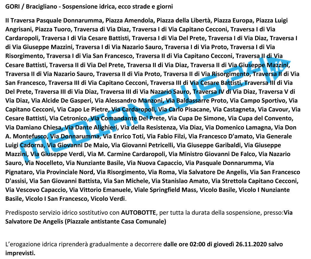 Tale riduzione comporterà mancanze d’acqua e abbassamenti della pressione idrica, dalle ore 06.00 del 25.11.2020 fino alle ore 02.00 del 26.11.2020, nella voci dei comuni elencati singolarmente l’elenco delle strade interessate alla chiusura mancanze d’acqua e abbassamenti della pressione.