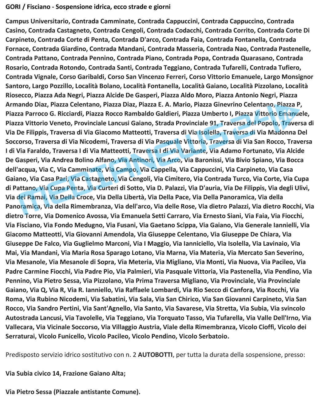 L’erogazione idrica riprenderà nei Comuni indicati gradualmente a decorrere dalle ore 02:00 di giovedì 26.11.2020 salvo imprevisti.