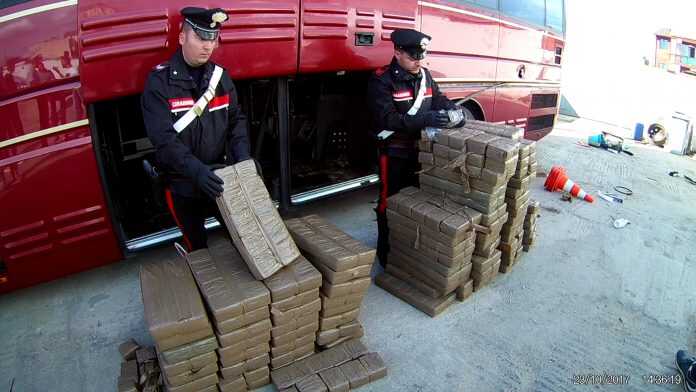 I quattro si erano organizzati per far giungere un grosso carico di stupefacente dalla Spagna a Villaricca. Per il trasporto avevano modificato un autobus, creando doppifondi e un nascondiglio a tenuta stagna. L’intervento dei carabinieri è scattato all’alba. L’auto di uno dei sospettati precedeva l’autobus – guidato dal fratello della proprietaria – mentre una Jeep con altri due indagati lo seguiva a vista. Il pedinamento dei mezzi si è protratto fino al deposito dei bus: a quel punto i militari dell’Arma sono intervenuti bloccando in sicurezza i quattro e procedendo alle perquisizioni. Tra pannelli, sedili e parti meccaniche, la scoperta: nel vano bagagli era stato creato un sistema di occultamento di ferro chiuso ermeticamente con silicone. Stesso sistema sotto le file dei sedili per i passeggeri. Rinvenuti 800 panetti di hashish, ciascuno del peso di un chilo. Tutto il carico era stato impregnato di aceto per nasconderne l’odore e sfuggire a eventuali controlli di Unità Cinofile.
