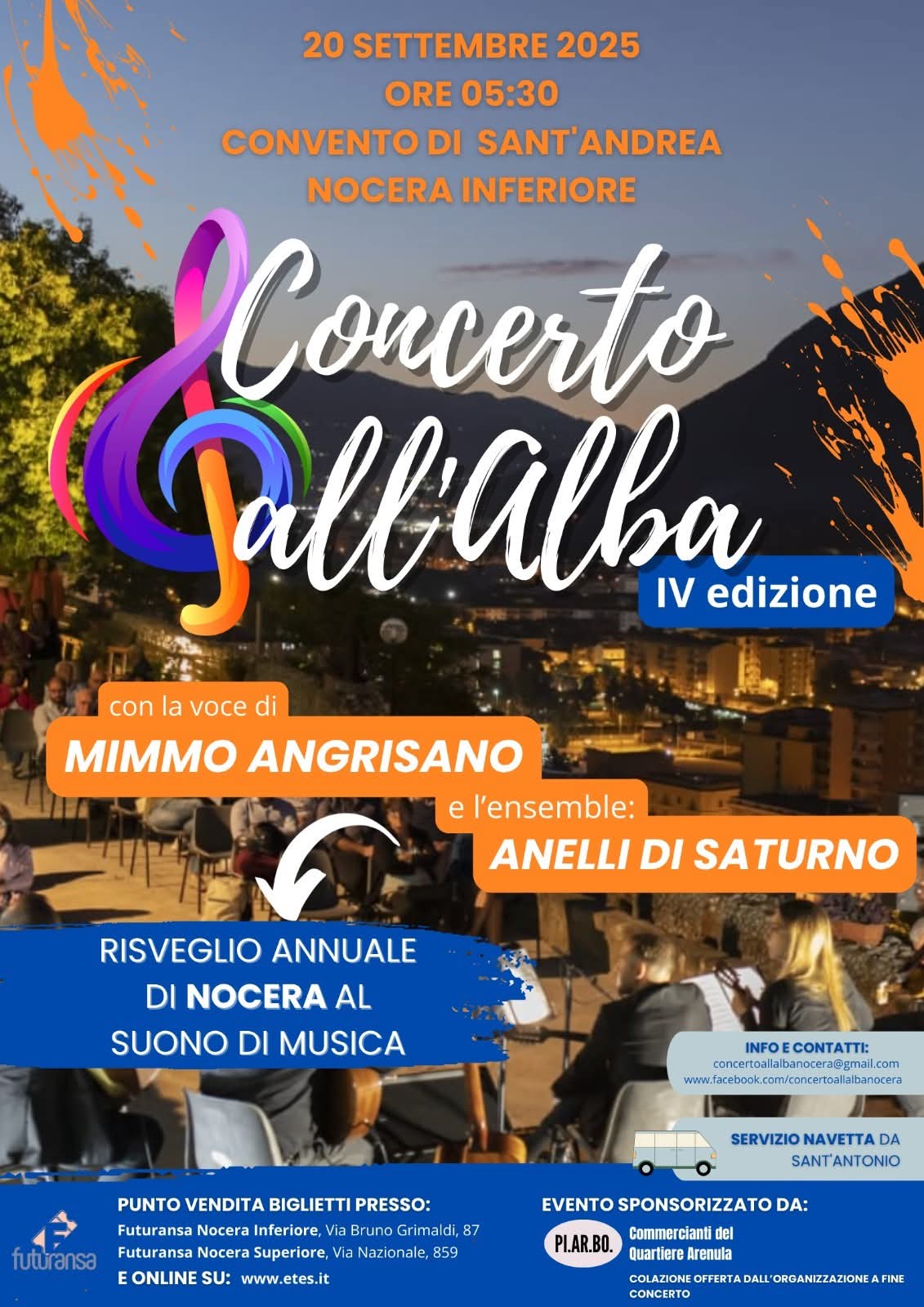 Sabato 20 settembre, poco prima che il sole osi farsi vedere, la città sarà teatro di un’esperienza che ha già scaldato tante anime: torna il “Concerto all’Alba”. Quarta edizione. Ambientazione: Convento di Sant’Andrea. Ora: 5:30 del mattino. Punto fermo: musica che diventa aurora, emozione che anticipa il chiarore. L’evento, fortemente voluto dal comitato presieduto da Vincenzo Ventura, si staglia come risposta concreta alle numerose richieste di replica ricevute dopo le prime tre edizioni.Sul palco saliranno “Gli Anelli di Saturno”, ensemble che da oltre dieci anni difende con coerenza la musica come arte alta, diretta da Antonio Saturno. A impreziosire l’alba, la voce del maestro Mimmo Angrisano.
