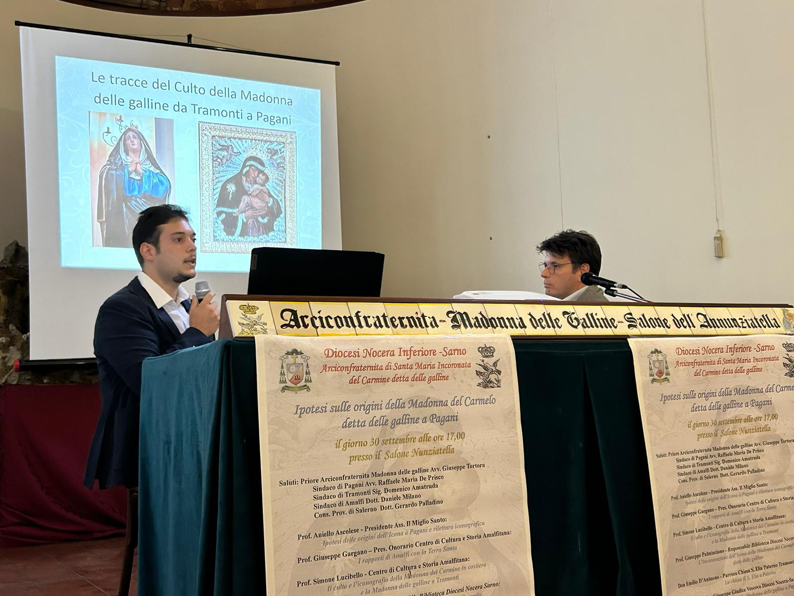 Il convegno è iniziato con i saluti del priore dell’arciconfraternita avvocato Giuseppe Tortora, ed è stato moderato da Salvatore D’Angelo che ha introdotto il cantore pellegrino di Pagani Vincenzo Romano, il quale ha ambientato l’assemblea con il canto dedicato alla Madonna “Flos Carmeli” insieme al suono della sua tammorra. Il convegno è iniziato con la relazione del professor Ascolese che ha delineato l’ipotesi di come l’Icona della Madonna del Carmelo, partita dalla Palestina insieme ai padri carmelitani cacciati dagli arabi nel 1291, sia arrivata a Tramonti nella località di Paterno, dove i confratelli laici che avevano vissuto precedentemente l’esperienza sul Carmelo avevano costruito una chiesa dedicata a Sant’Elia, loro ispiratore, e dove l’icona è rimasta fino alla fine del 1300 quando una pioggia catastrofica distrugge la chiesa e uccide tutti i confratelli. I pochi rimasti, fuggono verso Pagani fermandosi a Campinola piccola, frazione di Tramonti, per oltre un secolo. Viene poi costruita una chiesetta da una famiglia locale per ricordare questo passaggio e, infine, l’ultimo confratello laico rimasto porta questa icona davanti allo spogliaturo dell’ arciconfraternita della Nunziatella a Pagani, dove è coperta dal fango e dalla pioggia, che viene poi scoperta infine dalle galline.