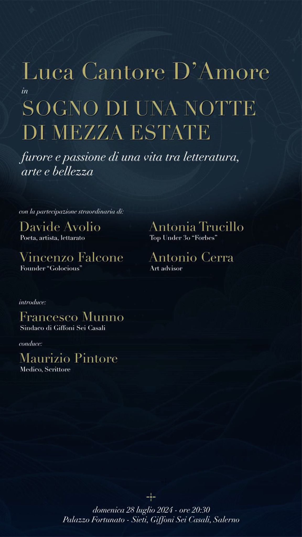 La serata dal titolo shakespeariano si tiene il giorno 28 luglio alle ore 20:30 presso il dolce borgo di Sieti, pregiato per bellezza storica e artistica, incastonato, come un diamante di rara fattezza, nel parco regionale dei Monti Picentini. Qui, il «divulgatore di bellezza» Luca Cantore D’Amore – critico d’arte per importanti realtà imprenditoriali come Rocco Forte Hotel e Ralph Lauren in qualità di Ambassador per l’Italia – tripudia l’arte, la bellezza e letteratura con personaggi di grande caratura artistica e imprenditoriale del panorama italiano.
