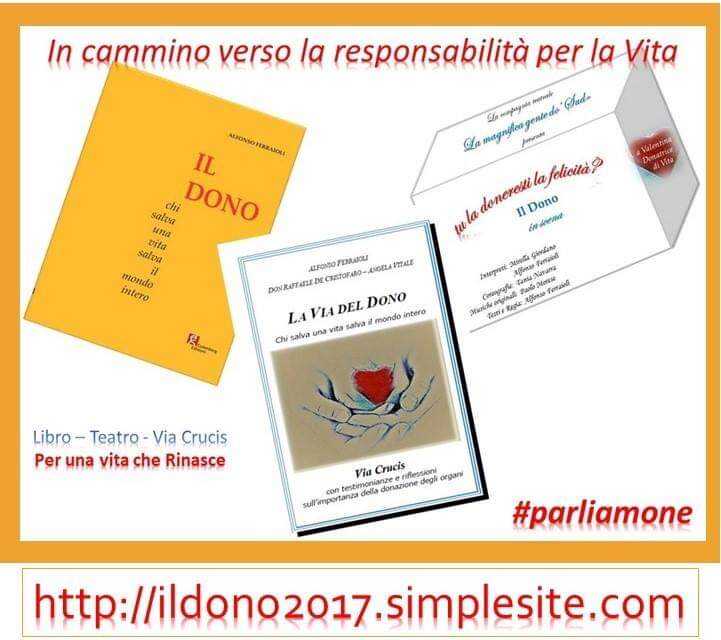 Ma Alfonso non si ferma qui, ricordando la sua attività teatrale mette in scena una riduzione teatrale del libro con un titolo che in fondo è una domanda allo spettatore, diretta, semplice ma efficace: Tu la doneresti la felicità?… il Dono in scena, iniziando così anche una divulgazione attraverso il teatro.Tutto si allarga e un’amica di Alfonso, la signora Angela Viale, leggendo il libro vede in alcuni passi delle meditazioni per una via Crucis, allora avvalendosi della collaborazione del sacerdote don Raffaele De Cristofaro, nasce la via Crucis con le meditazioni sulla importanza delle donazioni degli organi: La via del Dono.