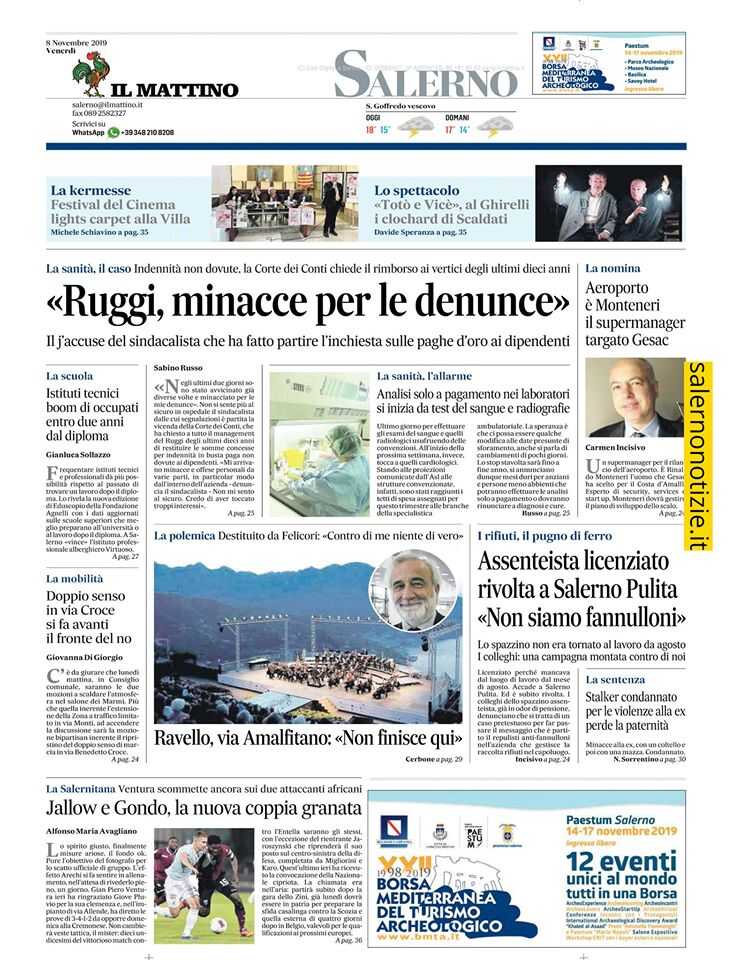 A centro pagina: Assenteista licenziato rivolta a Salerno Pulita «Non siamo fannulloni». Lo spazzino non era tornato al lavoro da agosto. I colleghi: una campagna montata contro di noi. I rifiuti, il pugno di ferro