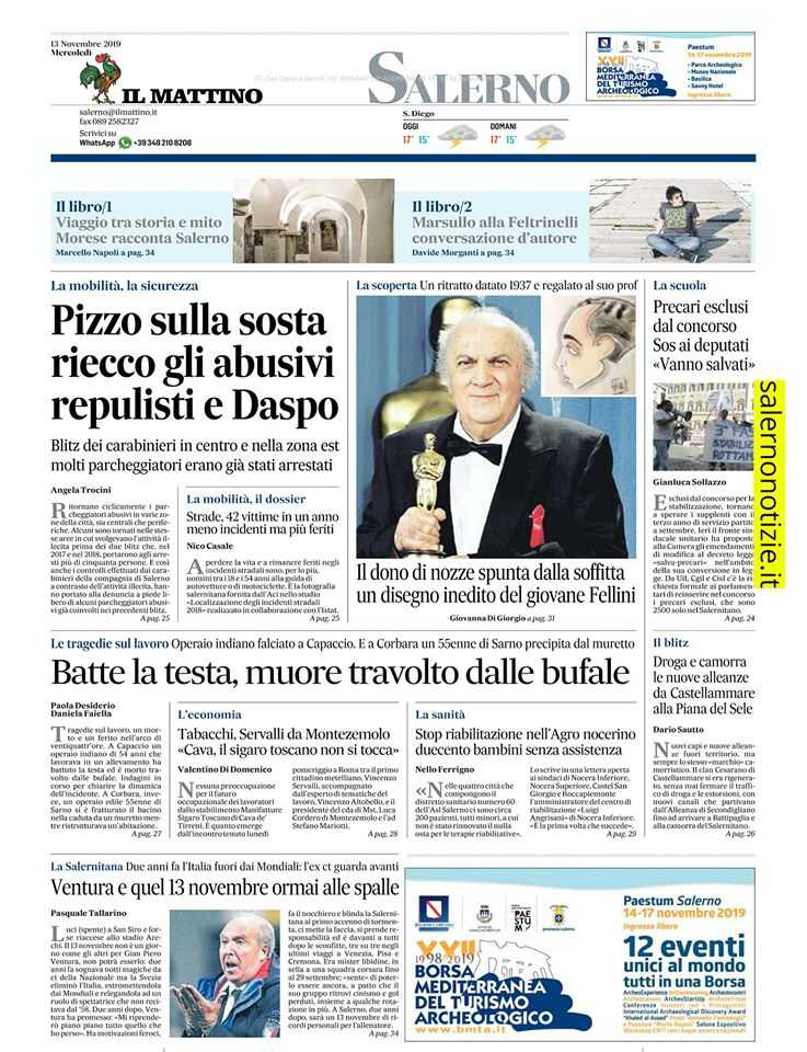 A centro pagina: Batte la testa, muore travolto dalle bufale. Le tragedie. sul lavoro Operaio indiano falciato a Capaccio. E a Corbara un 55enne di Sarno precipita dal muretto