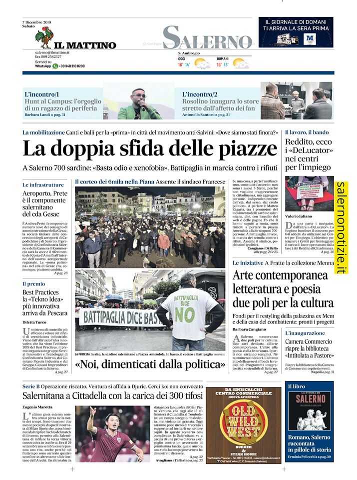 La doppia sfida delle piazze. A Salerno 700 sardine: «Basta odio e xenofobia». Battipaglia in marcia contro i rifiuti. La mobilitazione. Canti e balli per la «prima» in città del movimento anti-Salvini: «Dove siamo stati finora?»