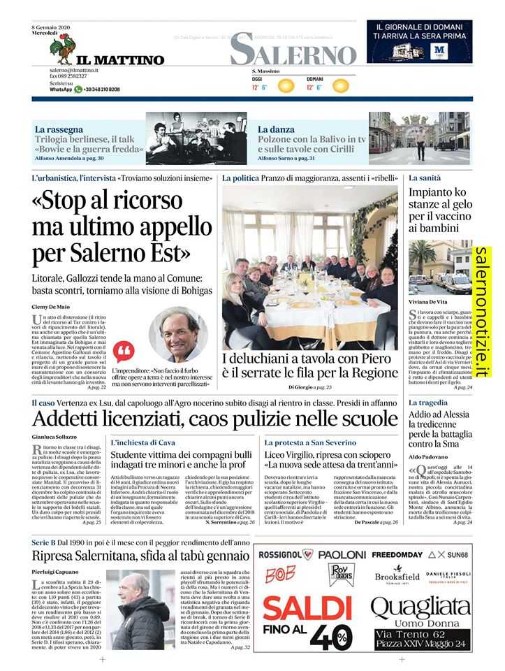 A centro pagina: Addetti licenziati, caos pulizie nelle scuole. Il caso. Vertenza ex Lsu, dal capoluogo all’Agro nocerino subito disagi al rientro in classe. Presidi in affanno